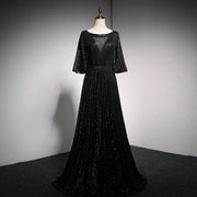 This black sequin evening dress features elegant trumpet sleeves and a floor-length silhouette, perfect for formal events and prom nights. The shimmering sequins add a sophisticated sparkle, while the tailored fit enhances your figure for a graceful and confident appearance. Ideal for making a memorable impression at any special occasion.