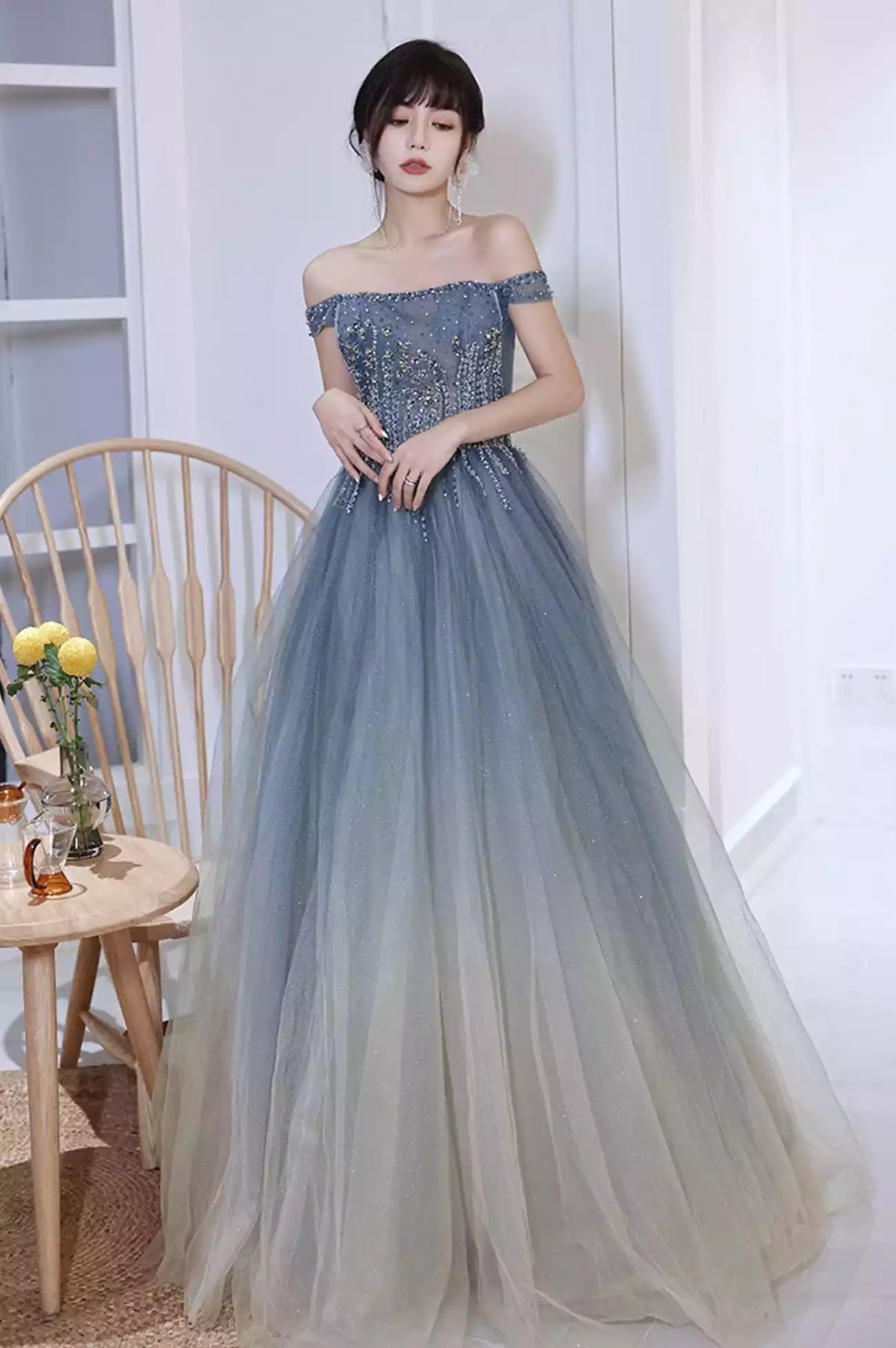 This elegant blue A-line prom dress features a stunning gradient effect on delicate tulle fabric, enhanced with intricate beadwork for a refined finish. Its long silhouette flatters the figure while offering graceful movement, making it an ideal choice for formal occasions. The combination of gradient hues and beaded details creates a sophisticated look that stands out with subtle charm.