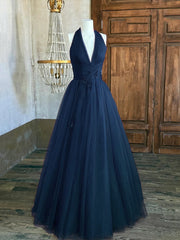 This elegant blue prom dress features a flattering V-neckline and a delicate lace-up design that enhances the silhouette. Crafted from soft tulle, its long flowing skirt adds graceful movement, while the backless detail offers a sophisticated, modern touch. Perfect for evening parties or formal events, this dress combines timeless style with contemporary elegance.
