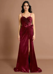 Bow Accent Convertible Strap Velvet Mermaid Ruched Bodice Open Back Train High Slit Floor Length Prom Dress