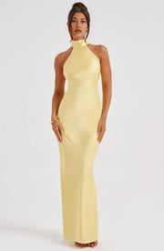 This evening dress has a sheath silhouette for a sleek, figure-hugging fit. The halter-neck design brings a bright, lively touch, while the sleeveless style keeps it light. The bow-back detail adds allure, and the floor-length fit makes it ideal for evening events helping the wearer feel confident and eye-catching.