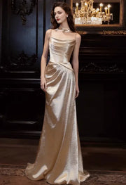 Champagne A Line Spaghetti Strap Pleated Satin Sleeveless Off-the-shoulder Floor length Prom Dress Cocktail Dress Homecoming Dress Evening Dress Party Dress - US 2 / UK 6 / EU 32