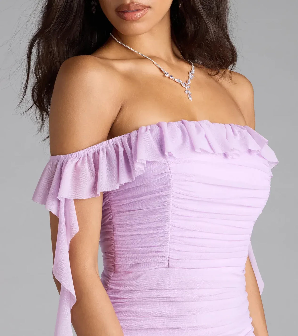 This prom dress presents a charming style with a mermaid silhouette that offers a sleek and body-contouring fit. The off-shoulder neckline brings a delicate and feminine touch, while the ruffle short sleeve design adds a playful and romantic element. The zipper back ensures a secure and tailored fit, enhancing the dress’s overall charm. With a floor-length design, it’s an excellent choice for prom, allowing the wearer to look charming and self-assured.