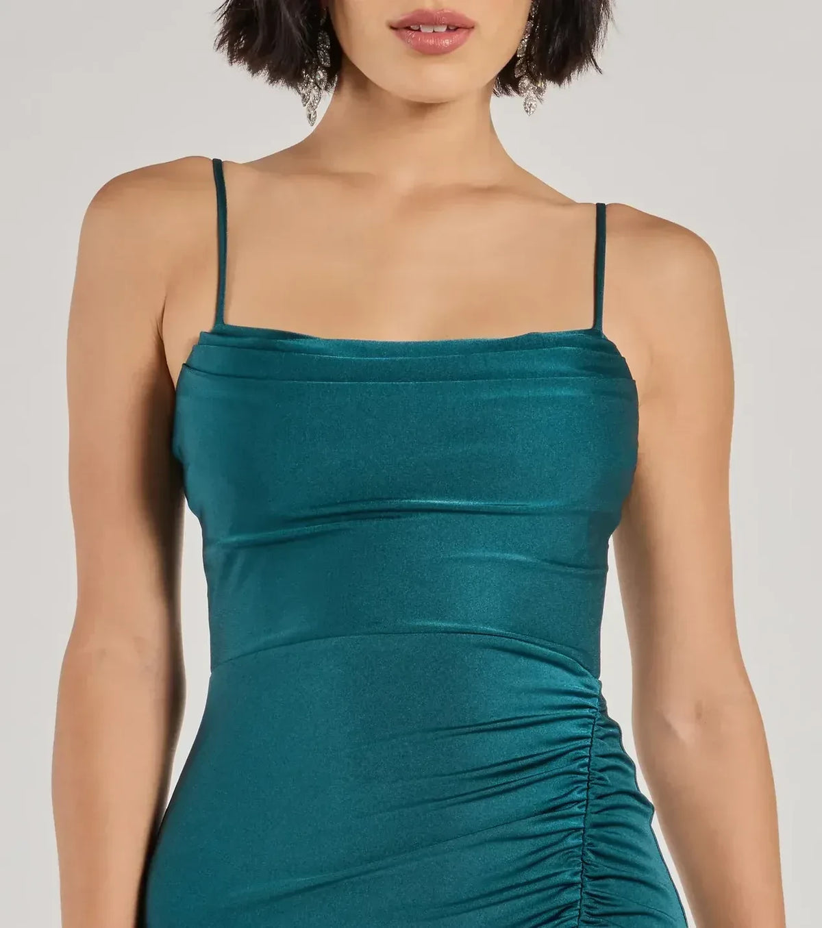Charming Mermaid Square Neck Spaghetti Strap Ruched Side Zipper Back Prom Dress occasion: Bridal showers Red carpet events Upscale parties Masquerade balls Formal corporate events White tie events Female guests