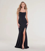 Step into chic style at prom with this trumpet dress. The square neckline offers a structured and modern look, and the spaghetti straps keep it delicate. The lace up back adds a touch of allure and adjustability, while the floor length skirt with a high slit flows beautifully, ensuring you stand out on prom night.