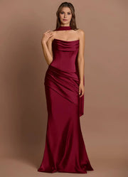 Choker Neck Satin Mermaid Cape Back Ruffled Side Floor Length For Ladies Prom Dress