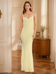 This elegant floor-length prom dress features delicate spaghetti straps and a sleeveless design, offering a graceful silhouette. The ruched detailing enhances the fit, while the backless style adds a touch of allure. Crafted with intricate lace, this column dress combines sophistication and modern charm, perfect for making a memorable impression at any formal event.