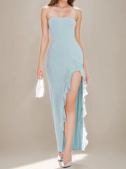 This elegant column dress features a strapless neckline and ankle-length hem, designed to enhance your silhouette with a sleek, modern fit. The high side slit adds a touch of allure and ease of movement, while delicate ruffles bring a refined, feminine detail. Perfect for evening events, parties, or proms, this dress combines sophistication with subtle drama to ensure you stand out gracefully.