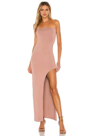 This prom dress features a sheath silhouette. It has a strapless neckline with a sleeveless design. The asymmetric high-slit style adds a bold charm, and the floor-length cut is perfect for prom events. Stretchy fabric and striking side slit create a sophisticated and eye-catching prom look.