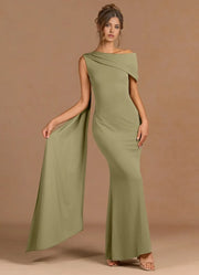 This prom dress features a mermaid silhouette with lightweight fabric, fitting closely to highlight curves. The one-shoulder draped sash add a distinct graceful touch, while the flared skirt brings dynamic movement. The floor length suits formal settings, making it ideal for prom events keeping the wearer confident and eye-catching.