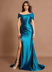 This prom dress features a mermaid silhouette with satin fabric for a sleek, lustrous look. The off-shoulder draped detail adds a distinct graceful touch, while the ruched waist brings subtle structure. The train and high slit boost movement, making it ideal for prom events keeping the wearer confident and eye-catching.