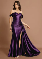 This prom dress features a mermaid silhouette with satin fabric, fitting closely to highlight curves. The off-the-shoulder draped train add a distinct dramatic touch, while the ruching brings textured charm. The high slit ensures ease of movement, making it ideal for prom events keeping the wearer confident and eye-catching.