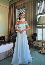 Elegant Baby Blue A Line Chiffon Satin Sleeveless Off-the-shoulder Floor length Prom Dress Cocktail Dress Homecoming Dress Evening Dress