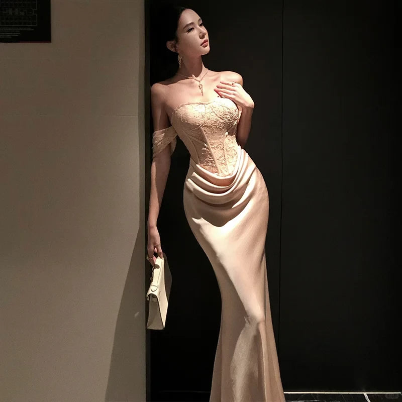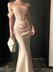 Hot Sale Long Prom Dresses Mermaid Off the Shoulder Apricot Lace Satin Floor length Sleeveless Off-the-shoulder Wedding Dress Prom Dress Cocktail Dress Evening Dress Party Dress