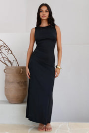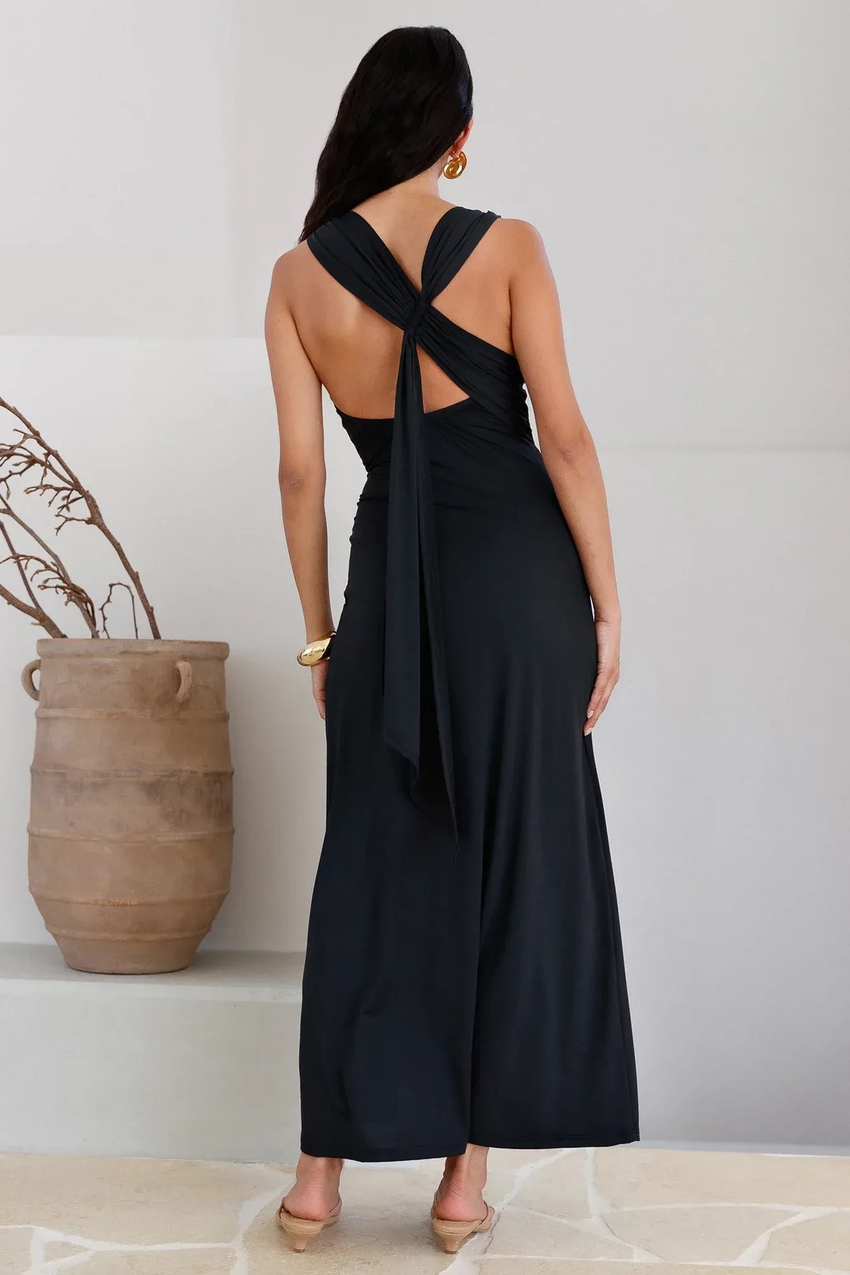 This prom dress features a sheath silhouette. It has a cowl neckline with a sleeveless design. The cross-back style adds a refined charm, and the floor-length cut is perfect for prom events. Soft fabric with elegant draping creates an elegant and sophisticated prom look.