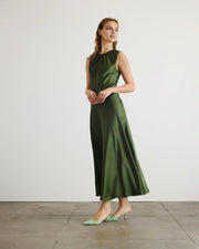 This prom dress features a sheath silhouette. It has a twist neckline with sleeveless design. The back-zip style ensures a sleek fit, and the floor-length cut is perfect for prom events. Satin-like fabric with subtle pleated detailing creates an elegant and sophisticated prom look.