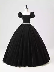 This elegant black velvet prom dress features short sleeves and a flattering long A-line silhouette, combining classic style with modern sophistication. The luxurious velvet fabric adds depth and richness, making it perfect for formal evening occasions. Its timeless design ensures comfort and grace, ideal for making a memorable impression at any special event.