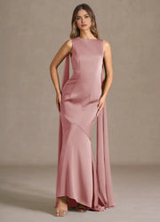 This ethereal trumpet prom dress features a crew neck, sleeveless design, and a tie-accent open back. The floor-length silhouette with flowing fabric panels adds soft movement, ideal for prom events.
