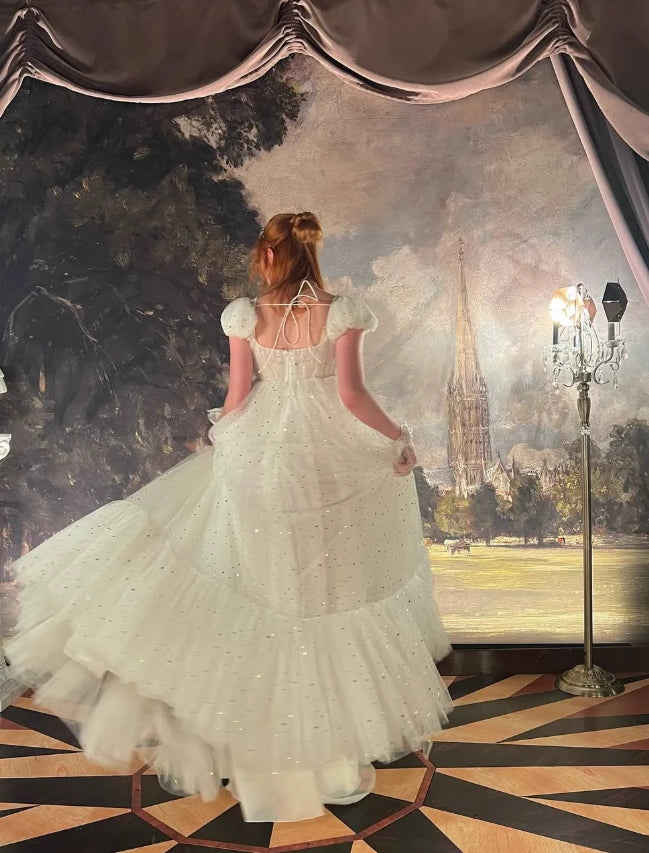 Flowy Gentle White A Line Puff Sequin Tulle Short Sleeves Floor length Prom Dress Cocktail Dress Homecoming Dress Evening Dress