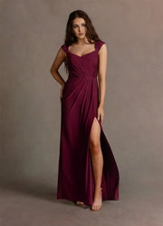 This fluid A-line prom dress features a sweetheart neck, lace cap sleeves, and a square back. The floor-length draped fabric with side slit adds soft allure, ideal for prom events.