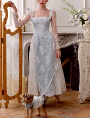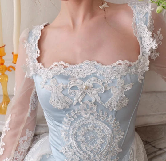 Gentle Baby Blue Satin White Lace Long Sleeve Floor length Prom Dress Cocktail Dress Homecoming Dress Evening Dress