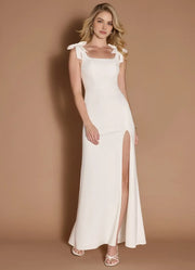 This gentle trumpet prom dress features a square neck, bow-accented shoulders, and an open back. The floor-length structured fabric silhouette with side slit adds soft charm, ideal for prom events.