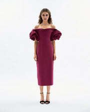 This prom dress features a sheath silhouette. It has an off-shoulder neckline with puff sleeves. The back-zip style ensures a sleek fit, and the midi-length cut is perfect for prom occasions. Structured fabric with dramatic sleeve detailing creates a glamorous and sophisticated prom look.