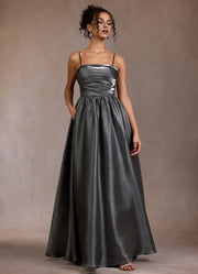 This prom dress has a ballgown silhouette with shiny fabric for a voluminous, smooth fit. The square-neck design adds a distinct, sleek touch, while the sleeveless style keeps it light. The open-back detail brings subtle allure, and the floor-length ruffled skirt balances fullness and grace ideal for prom events, helping the wearer feel confident and vibrant.