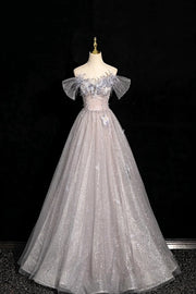 Gray Tulle Sequins Lace-up Long Prom Dress Gray Off the Shoulder Party Dress