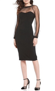 Illusion long-sleeve prom dress features a sleek sheath silhouette that hugs the body,Fitted bodice, Midi dress, Illusion sleeves, V Open back,enhancing your natural curves with a tight fit. The knee-length design offers a balanced blend of elegance and allure, while the illusion detailing on the sleeves adds a sophisticated, modern touch. Crafted to deliver a flattering and confident look, this dress is ideal for special occasions where style and comfort matter. Perfect for ladies seeking a refined yet striking ensemble for prom or formal events.