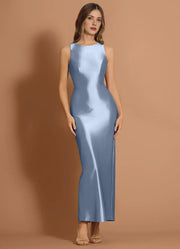This prom dress features a sheath silhouette with satin fabric for a sleek, polished look. The sleeveless round neck adds a distinct refined touch, while the keyhole back brings subtle allure. The high slit boosts movement, making it ideal for prom events keeping the wearer confident and eye-catching.