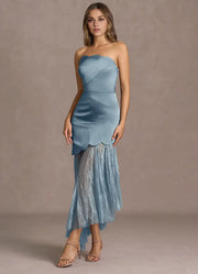 This prom dress features a mermaid silhouette with mixed fabrics (satin bodice lace overlay skirt) for a textured, romantic look. The strapless neckline adds a distinct soft touch, while the scalloped hem and open back bring subtle charm. The midi length suits semi-formal settings, making it ideal for prom events keeping the wearer confident and eye-catching.