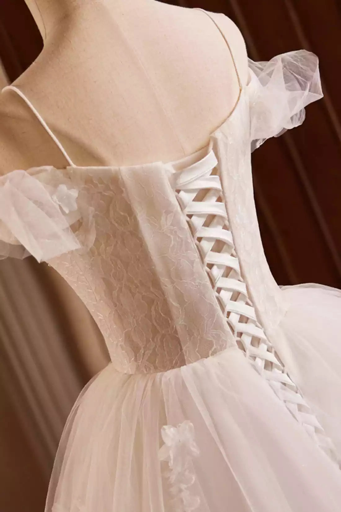 This elegant floor-length evening dress features a flattering A-line silhouette in a delicate light champagne hue. Crafted with intricate lace and adorned with subtle beadwork, it offers a refined texture and sophisticated detail. The spaghetti straps add a graceful touch, making it ideal for formal events and special occasions where timeless style and comfort are essential.