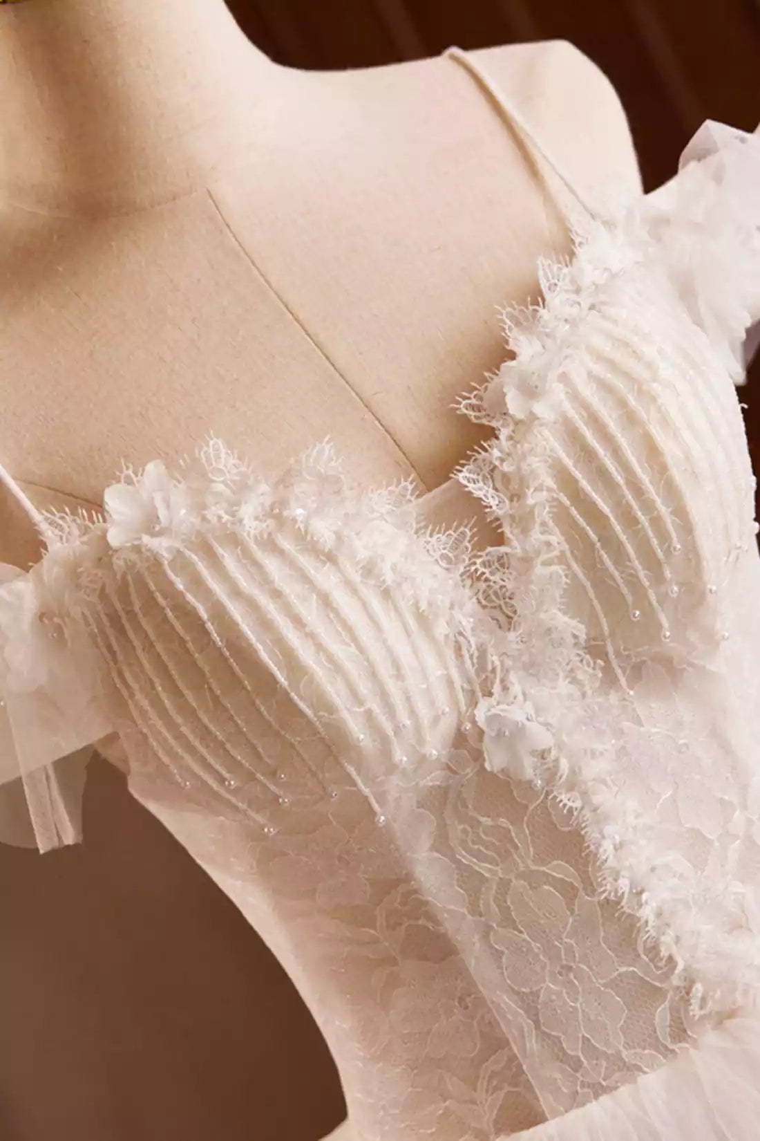 Light Champagne Floor Length A-Line Spaghetti Strap Lace Beaded Party Dress Formal Evening Dress