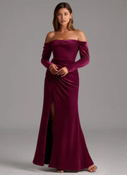 This striking trumpet prom dress features an off-the-shoulder neckline, ruched long sleeves, and a cut-out back. The floor-length silhouette includes a side slit, ideal for formal prom events.