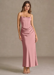 This satin mermaid prom dress features a square neckline, spaghetti straps, and a lace-up open back. The floor-length silhouette has ruched accents, ideal for formal prom events.
