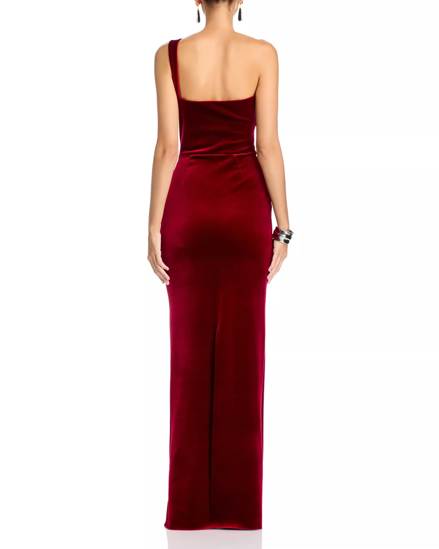 This velvet sheath prom dress features a sweetheart neckline, one-shoulder design with ruched details, and an open back. The floor-length silhouette offers a sleek fit, ideal for formal prom events.