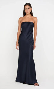 This evening dress features a sheath silhouette for a figure-hugging, sleek fit. The strapless neckline adds a clean, distinct touch, while the sleeveless style keeps it light. The open-back detail brings subtle allure, and the floor-length cut balances structure and grace ideal for evening events, helping the wearer feel confident and composed.