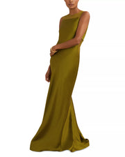 This lustrous trumpet prom dress features a high neck, sleeveless design, and a cut-out back. The train-length smooth fabric silhouette adds rich allure, ideal for prom events.