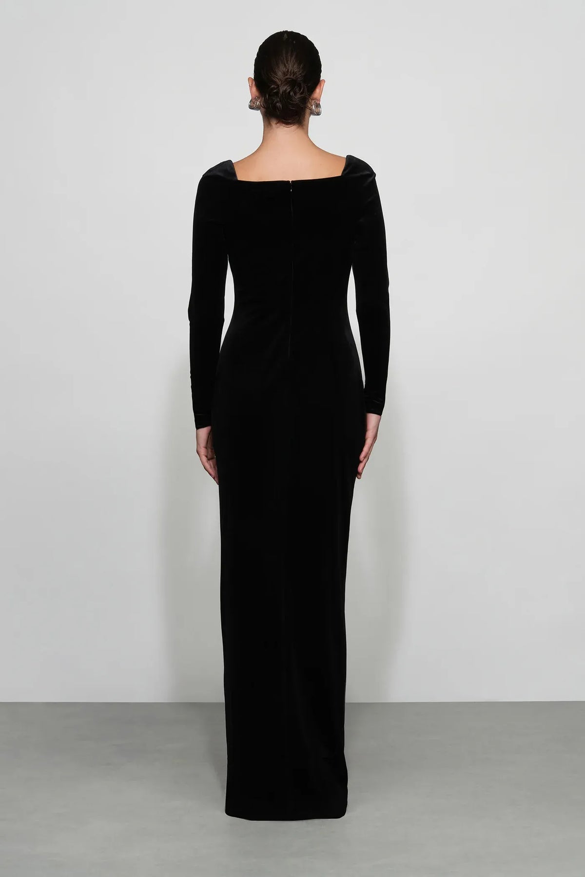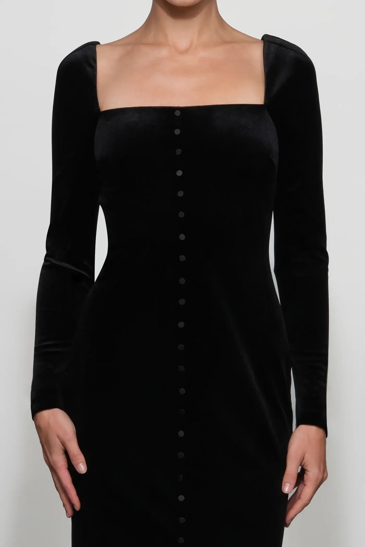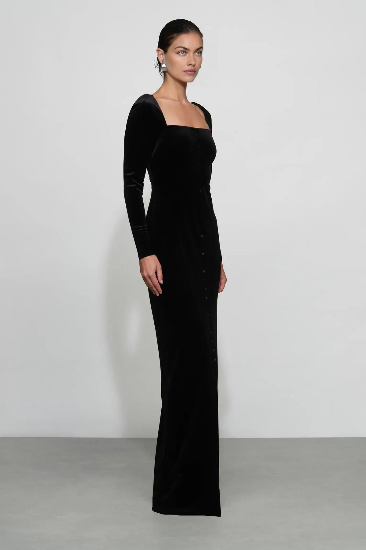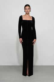 This luxe sheath prom dress features a square neck, long sleeves, and a zipper back. The floor-length velvet fabric with front buttons adds rich allure, ideal for prom events.