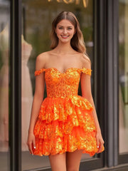This elegant orange A-line dress features a flattering sweetheart neckline and off-the-shoulder design, enhancing its sophisticated appeal. The tiered short-length skirt adds playful movement, while the sleeveless cut ensures comfort and ease. A lace-up back provides adjustable fit and a touch of classic charm. Delicate ruffles and subtle sequins complete the look, making it perfect for special occasions where style and grace are paramount.