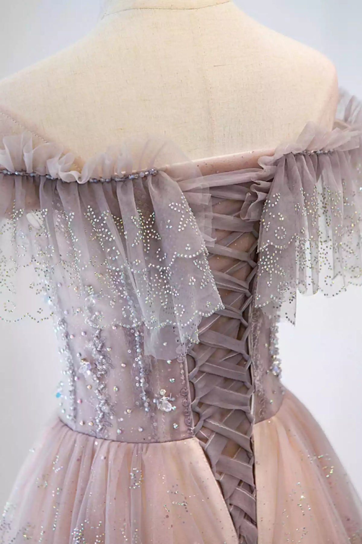 Pink V-Neck Pink Tulle Beaded Long Formal Dress Prom Dress