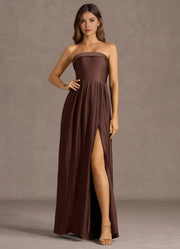 This prom dress features an A-line silhouette with satin fabric for a light, elegant look. The strapless design adds a distinct refined touch, while the pleated skirt brings subtle movement. The high slit boosts dynamism, making it ideal for prom events keeping the wearer confident and eye-catching.