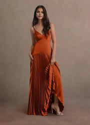 This prom dress features a sheath silhouette with satin fabric (smooth bodice pleated skirt) for a layered, sleek look. The spaghetti-strap V-neck adds a distinct delicate touch, while the open back and asymmetrical hem bring subtle movement. The floor length suits formal settings, making it ideal for prom events keeping the wearer confident and eye-catching.