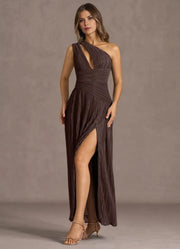 This prom dress features a sheath silhouette with all-over pleated fabric for a textured, sleek look. The one-shoulder neckline (with keyhole cut) adds a distinct modern touch, while the high slit boosts movement. The floor length suits formal settings, making it ideal for prom events keeping the wearer confident and eye-catching.
