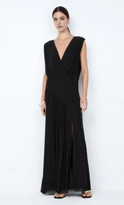 This evening dress has an A-line silhouette for a flowing, balanced fit. The V-neck design brings a polished, sophisticated touch, while the sleeveless style keeps it light. The deep-V-back detail adds allure, and the floor-length fit makes it ideal for evening events helping the wearer feel confident and refined.