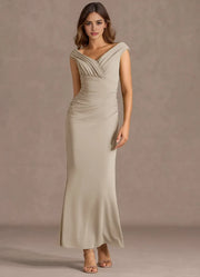 This ruched trumpet prom dress features an off-the-shoulder neckline, cap sleeves, and a cross-back design. The floor-length silhouette offers a tailored fit, ideal for formal prom events.