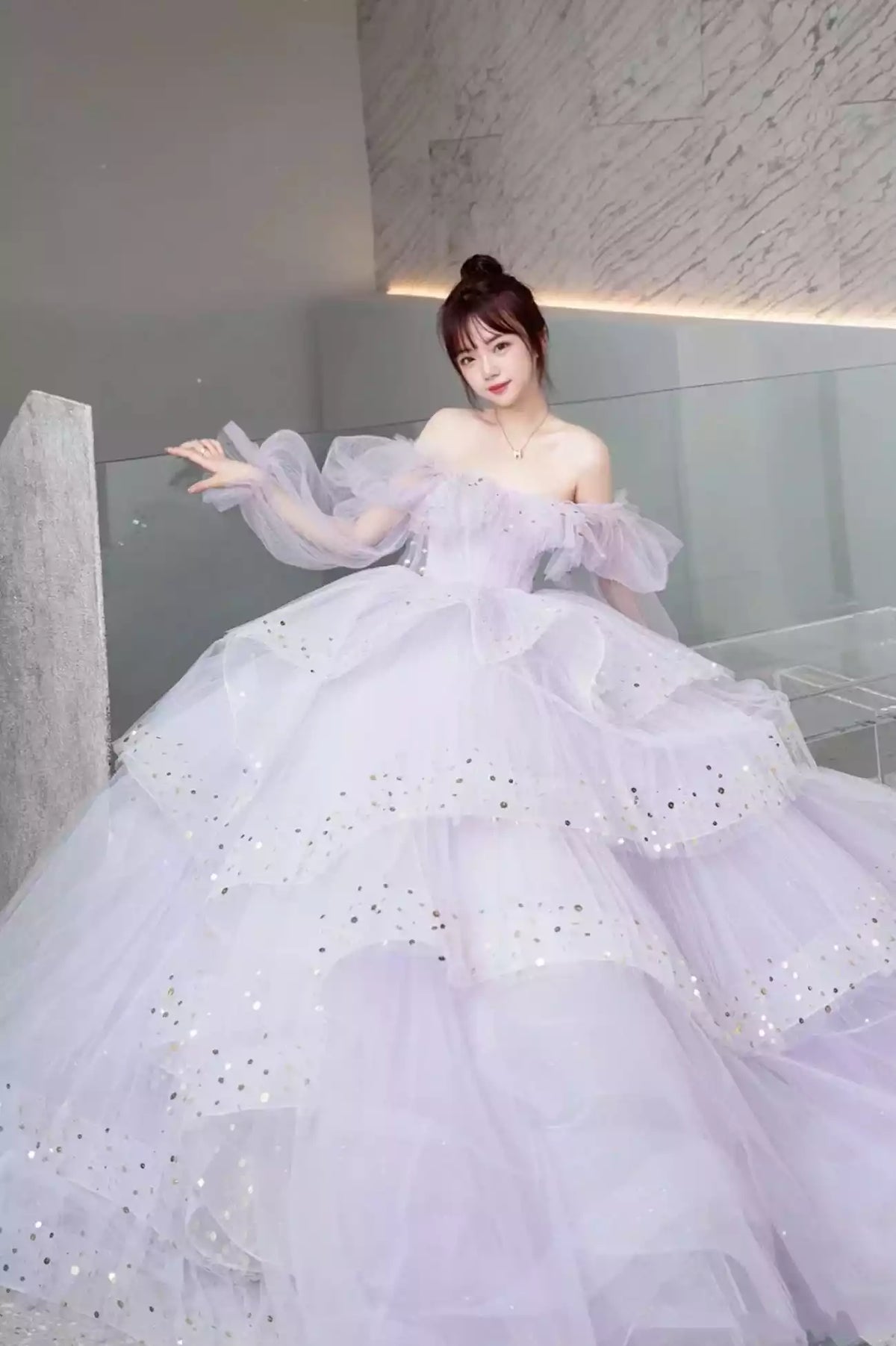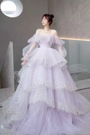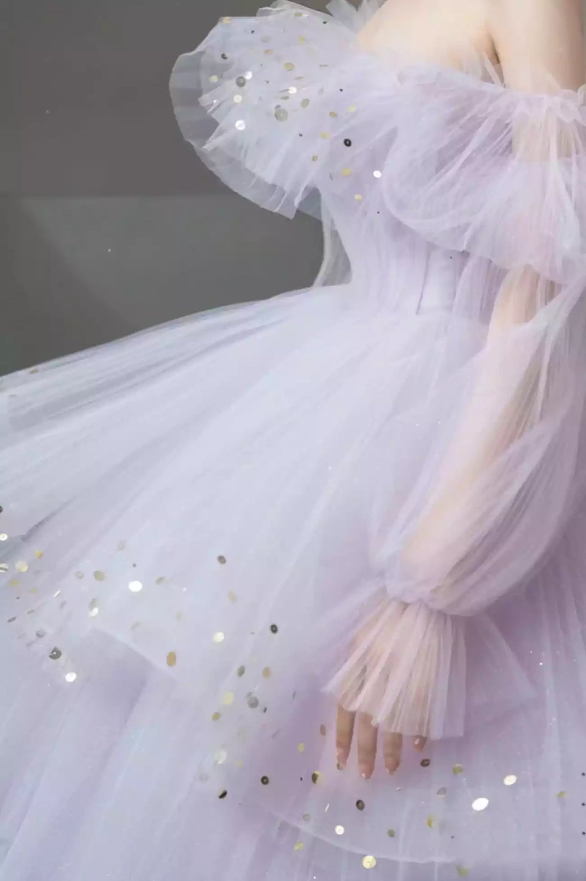 This elegant purple formal dress features long sleeves and a floor-length tulle skirt, perfect for a Sweet 16 celebration or any special occasion. The flowing tulle fabric adds a graceful silhouette, while the rich purple hue offers a sophisticated and timeless look. Designed to combine comfort with style, this dress ensures you stand out with refined elegance.