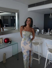 Beautiful Long Prom Dresses Blue Print Floral Strapless Satin Long Outfit Off-the-shoulder Floor length Long Wedding Dress Prom Dress Cocktail Dress Evening Dress Party Dress