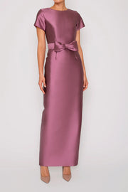 This smooth sheath prom dress features a crew neck, short sleeves, and a V-back. The midi-length satin silhouette with a waist bow accent adds refined charm, ideal for prom events.